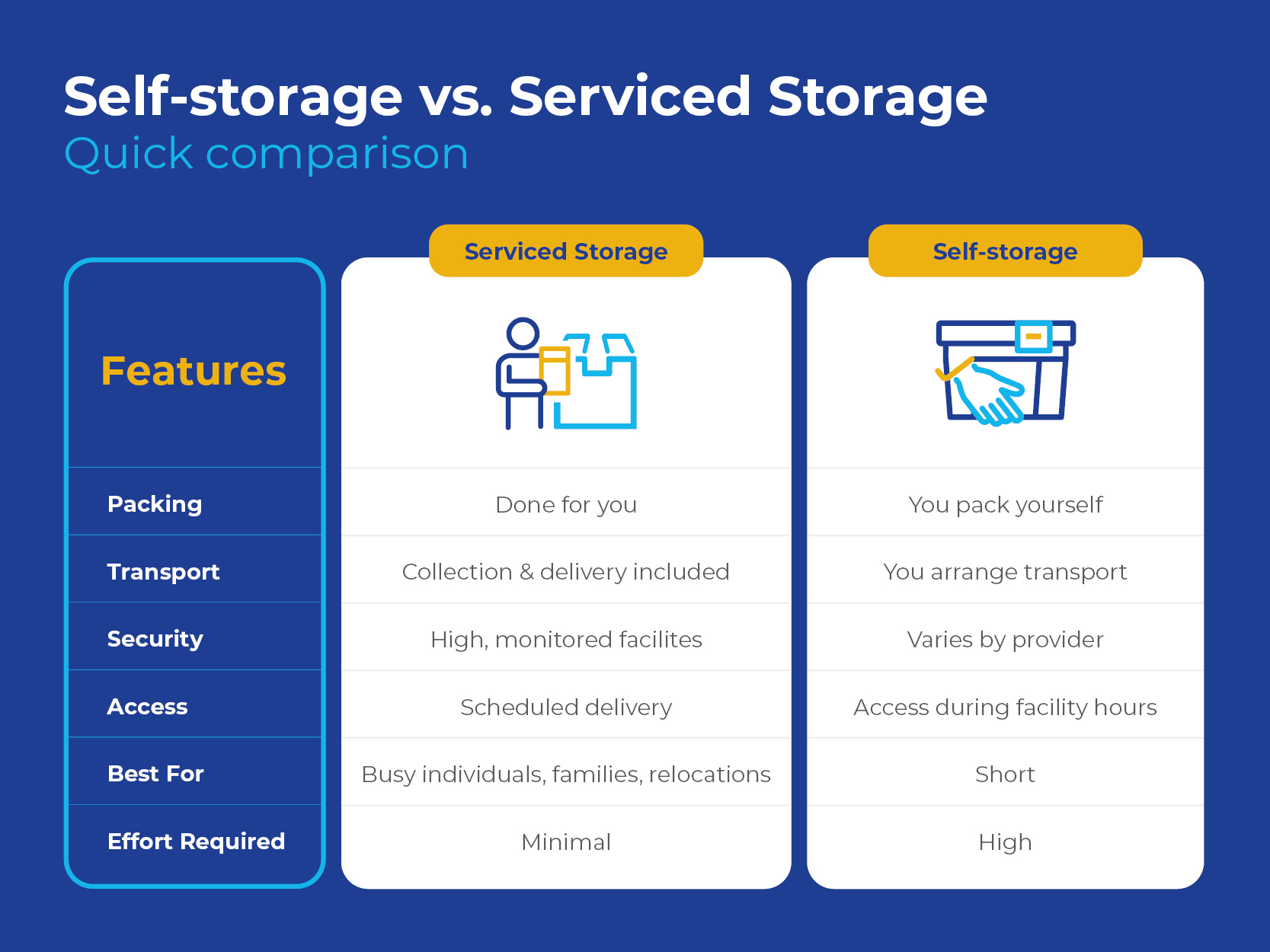Serviced storage is usually better for long‑term storage, as it offers higher security, professional packing, and less effort over time.
