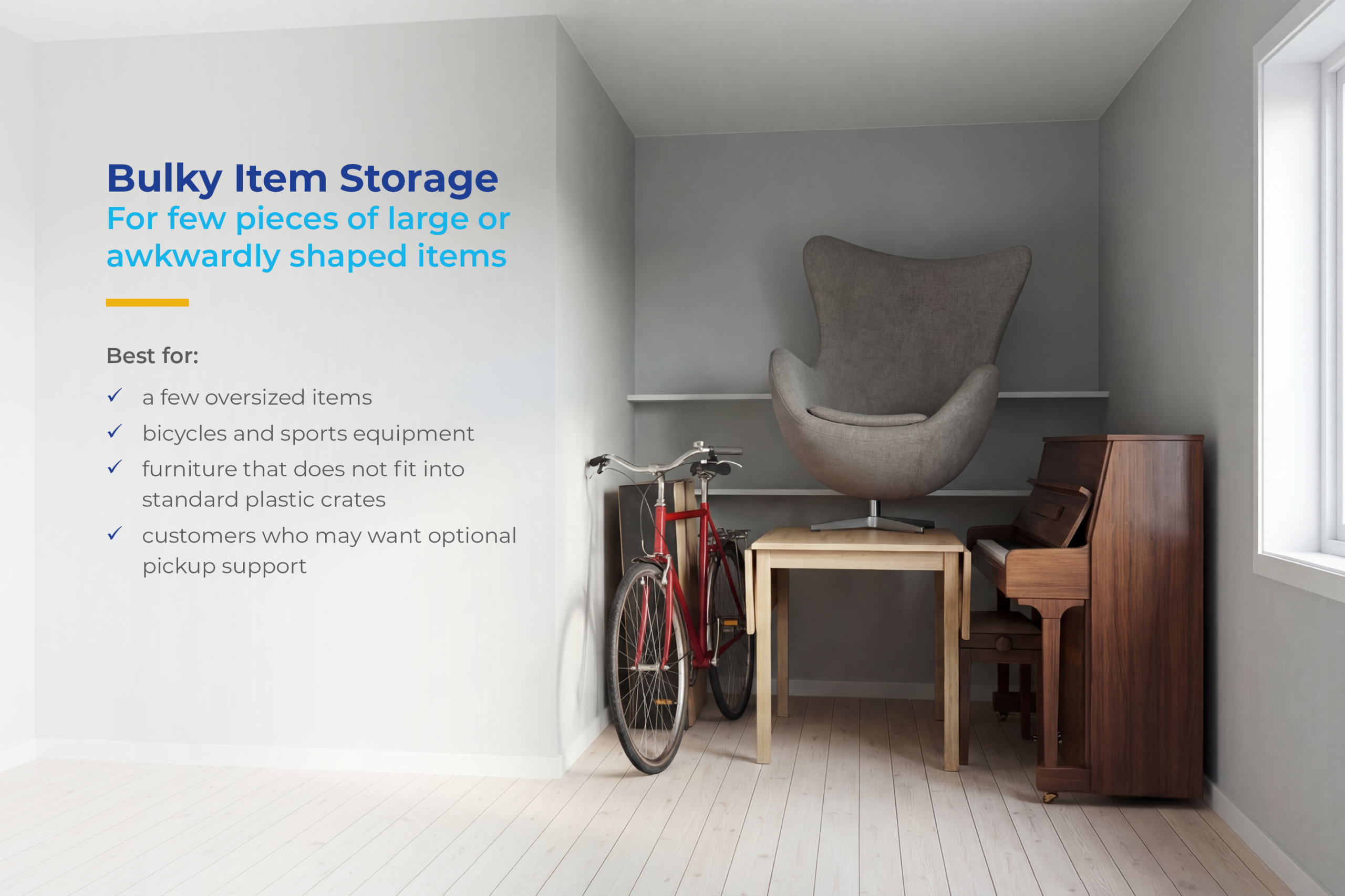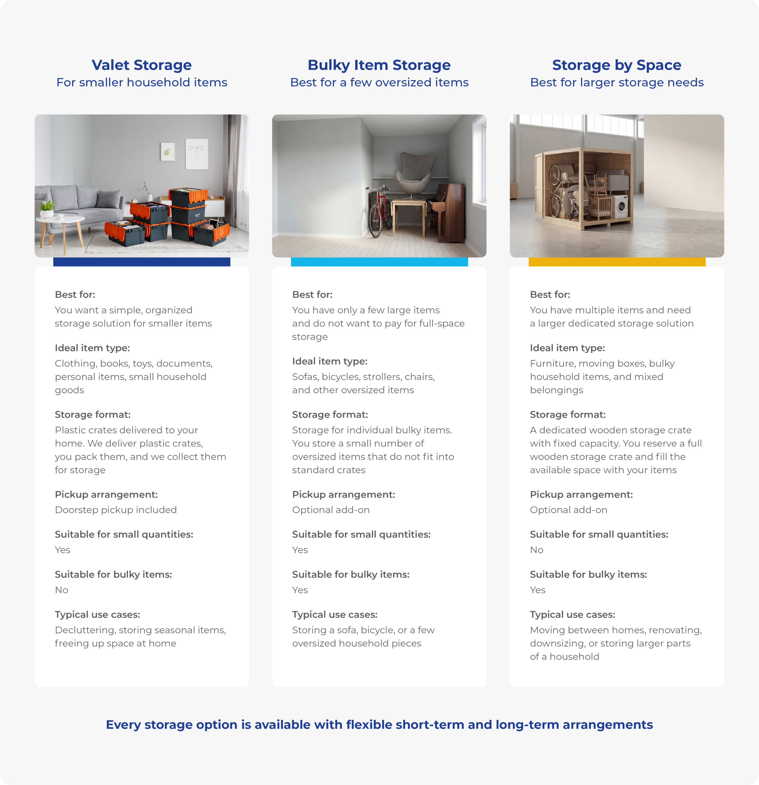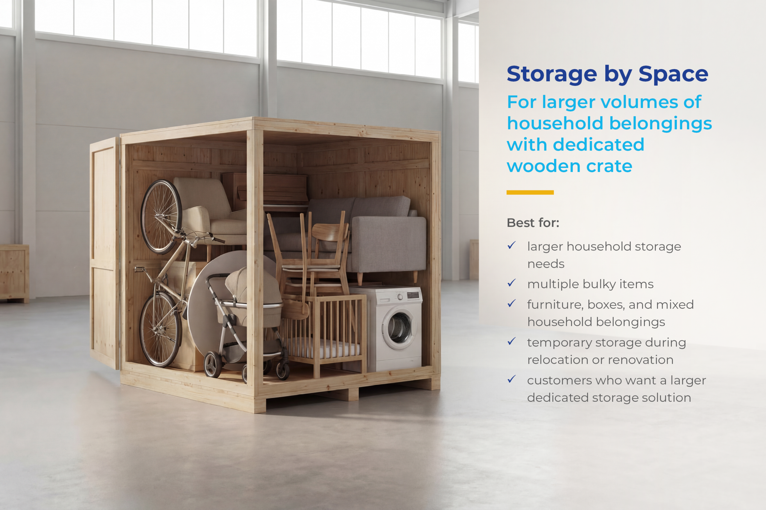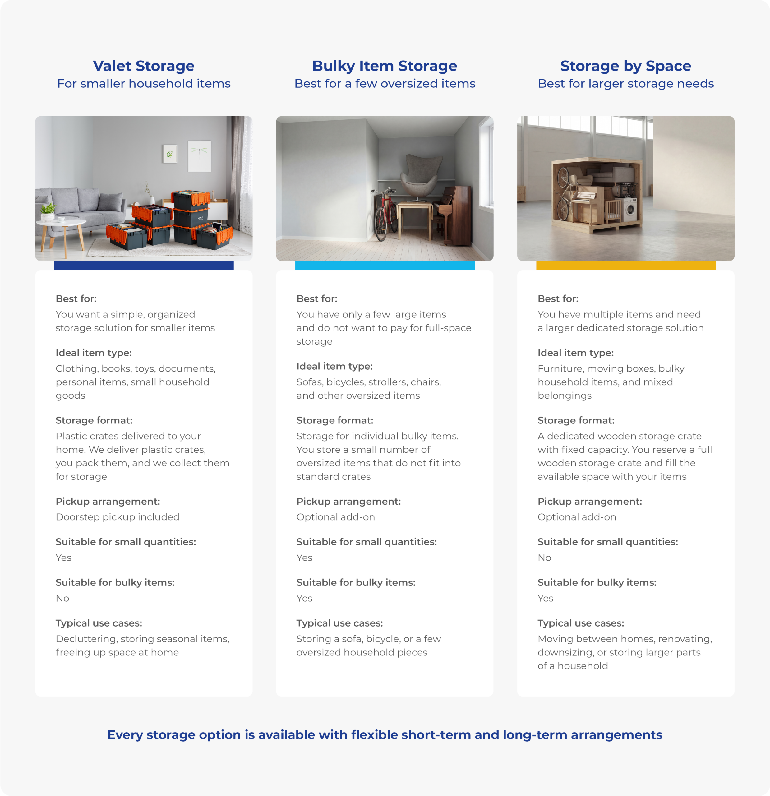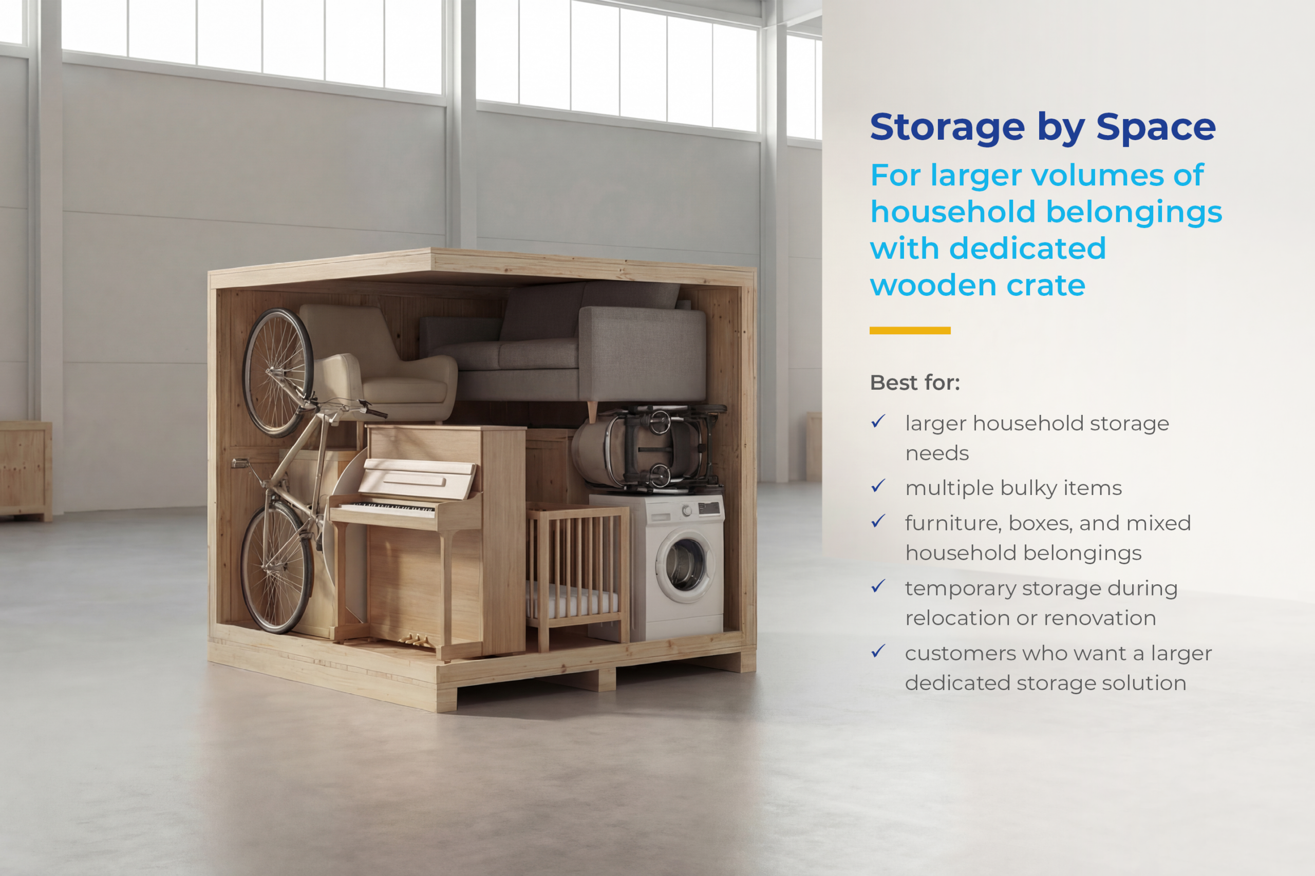Not every storage need is the same. Some customers only need a few plastic crates for personal items. Others need storage for large or awkwardly shaped items that do not fit into standard containers. Some need a larger dedicated storage space for multiple household belongings at once. That is why we offer three flexible storage options, so you can choose the solution that best fits your items, budget, and timeline.